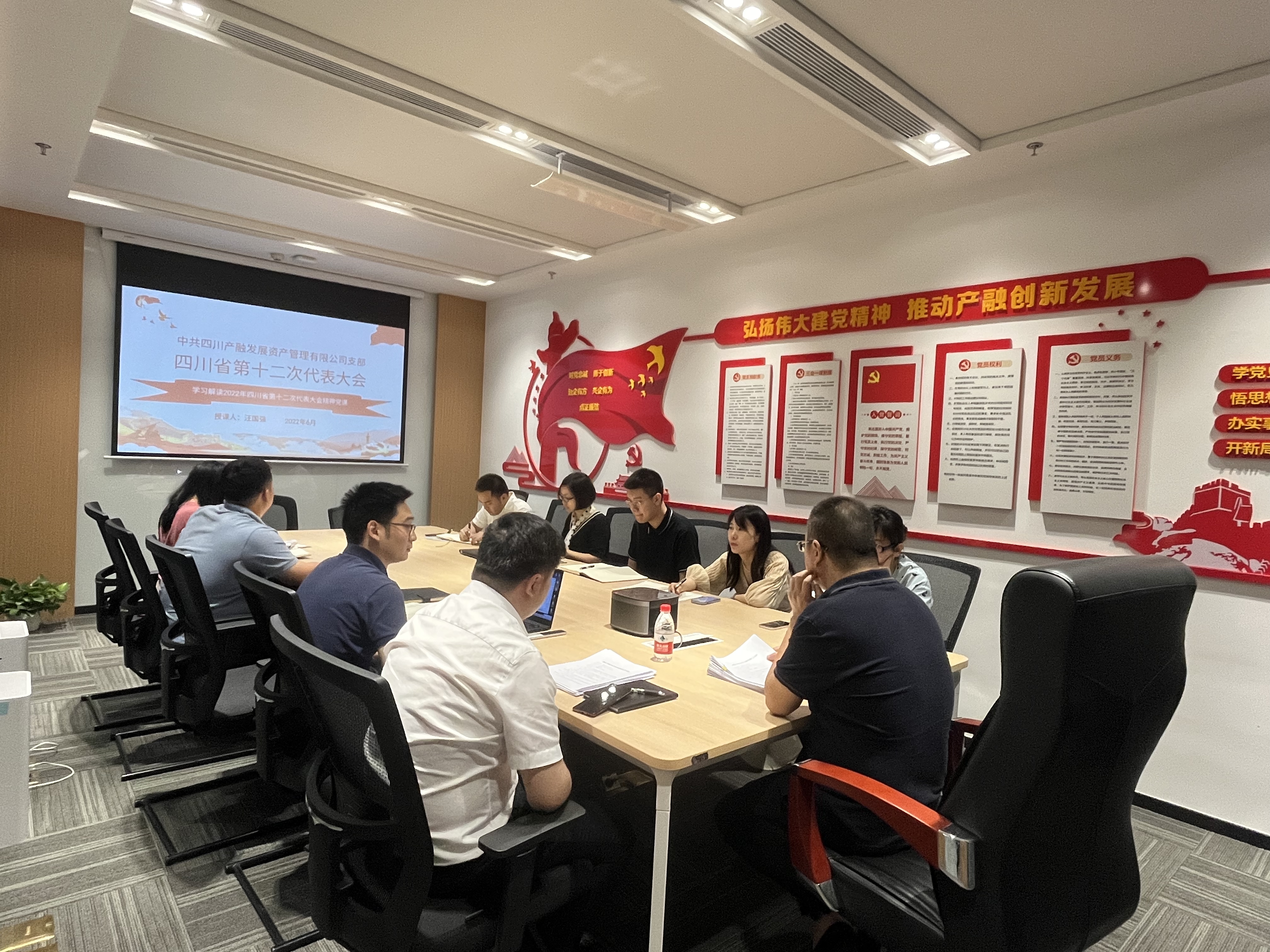 6月20日,四川产融党支部召开6月主题党日活动暨省十二次党代会精神专题党课,深入学习了《习近平:在新的征程上奋力谱写四川发展新篇章》、贯彻落实学习省委十一届十一次全会、省第十二次党代会和省委十二届一次全会精神,并研究贯彻落实意见。公司党支部书记、董事长汪国强主持会议并开展专题党课。公司全体干部职工参加会议。