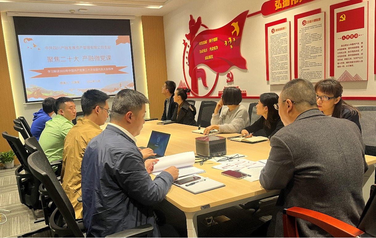 10月27日,四川产融党支部开展“聚焦二十大 产融微党课”活动,支部书记、董事长汪国强宣讲党的二十大精神,讲授微党课。