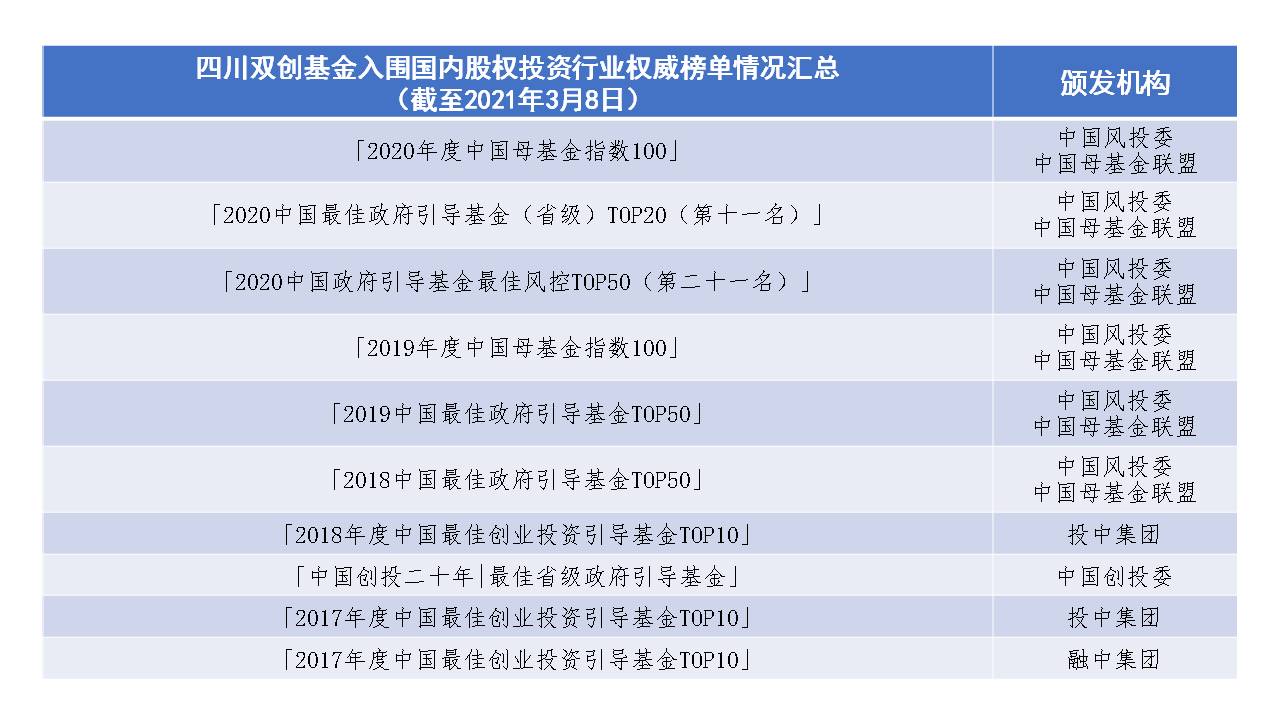 大会期间,主办方发布了《2020中国母基金100指数报告》榜单。凭借管理的四川省创新创业股权投资基金(下称「四川双创基金」),四川产业振兴基金集团旗下机构「川创投」位列其中,系中国西部地区五家(我省三家)入选该榜单的母基金之一——这是近4年来,「四川双创基金」第10次入围由国内股权投资行业权威机构发布的榜单。