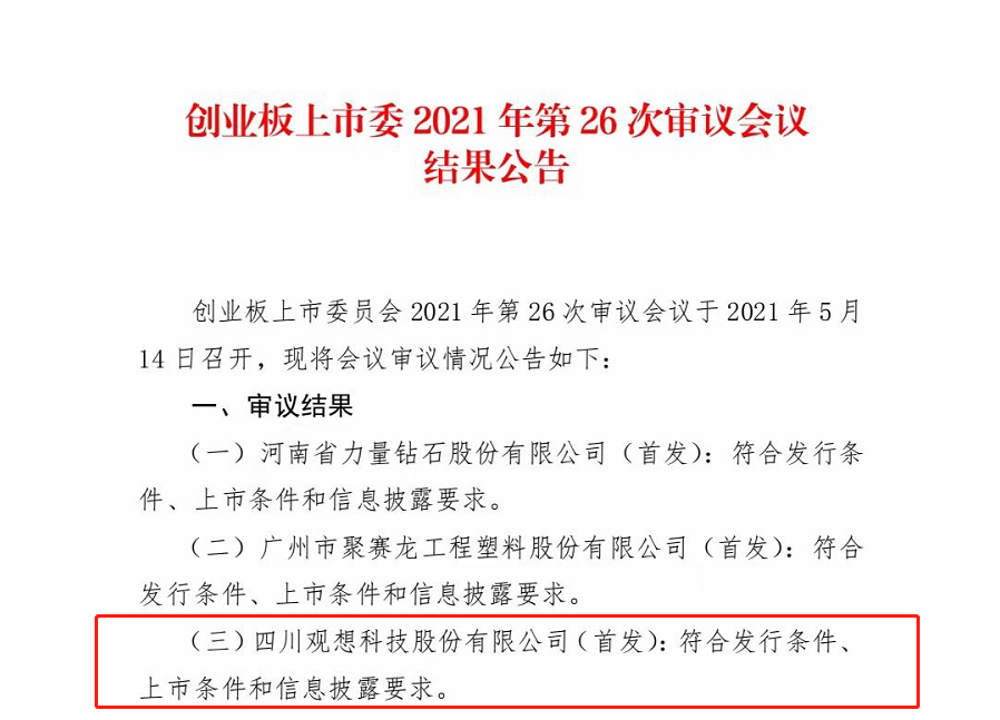 5月14日,深圳证券交易所创业板上市委员会召开2021年第26次发行审核委员会工作会议,根据审议结果显示,同意「观想科技」发行上市(首发)。