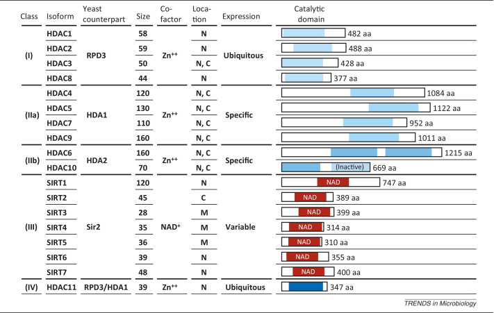 根据酵母蛋白的同源性,可将目前在人体中已发现的18种HDAC分为四类(Class I、II、III 和 IV)。其中,I类(HDAC1,2,3,8)为专门表达于细胞核的HDAC,II类(HDAC4,5,6,7,9和10) 可以在细胞核与细胞质间移动,IV类(HDAC11)与I类和第II类相似,但拥有更高的组织特异性。III类(SIRT1,2,3,4,5,6和7)Sirtuins是NAD+依赖型蛋白,非金属依赖型,也没有锌离子催化位点。对应地,主流的HDAC抑制剂也有四大种类。