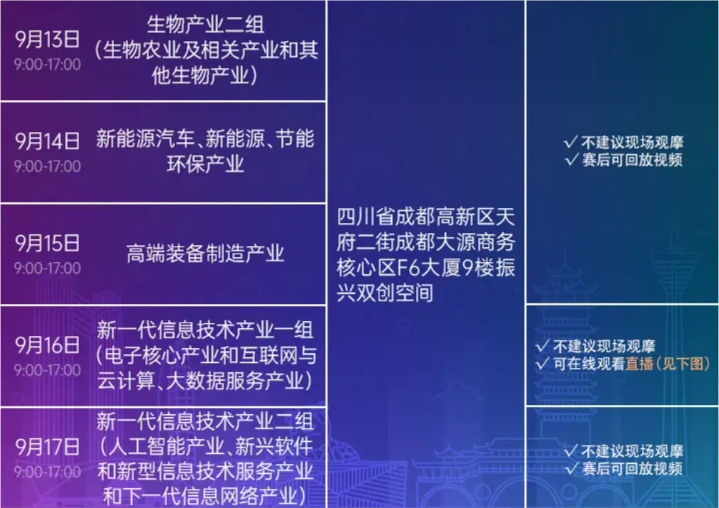 根据大赛赛程设置,大赛参赛企业被划分到生物产业二组(生物农业及相关产业和其他生物产业),新能源汽车、新能源、节能环保产业,高端装备制造产业,新一代信息技术产业一组(电子核心产业和互联网与云计算、大数据服务产业),新一代信息技术产业一组(人工智能产业、新兴软件和新型信息技术服务产业和下一代信息网络产业)等5个产业组,于9月13日至17日分别进行角逐。