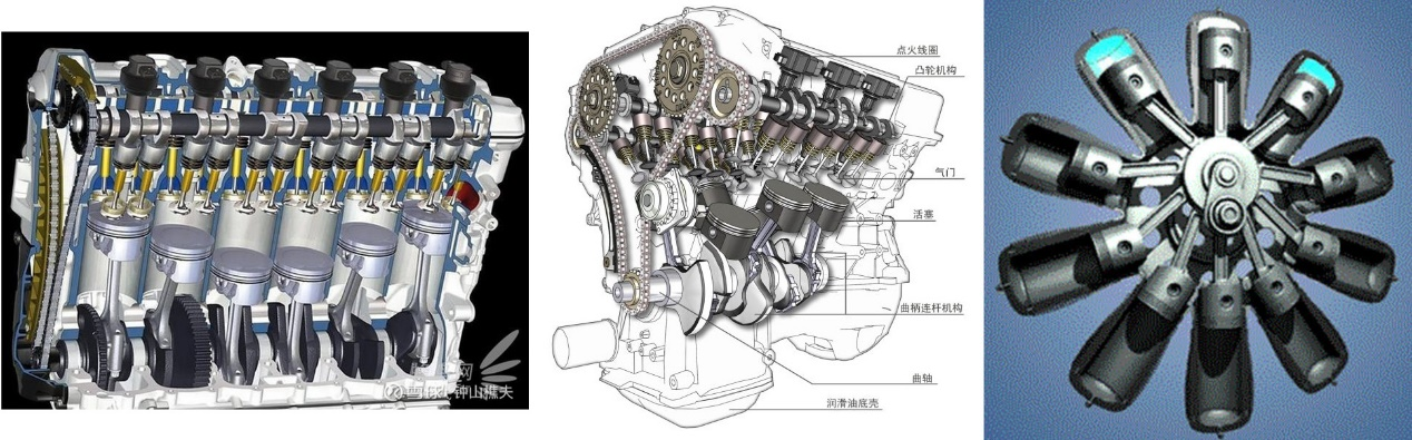 图2:各式活塞式发动机结构示意图(从左到右:6缸直列式发动机、6缸V型发动机、10缸星型发动机)