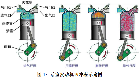 活塞式发动机是一种利用燃料-空气混合物在燃烧时体积膨胀而推动活塞做工的动力机械。活塞发动机启动时,混合了燃料的空气从进气口喷入燃烧室,由火花塞点火,燃烧膨胀后的空气推动活塞运动,并通过连杆带动曲轴转动对外做功,完成化学能到机械能的转化。在此过程中,活塞需要上下运动四次,称为四个冲程;活塞和曲轴的连杆中点会往返轨迹顶点和底点四次,称为四个行程。四冲程+四行程构成了一个完整的工作循环,活塞发动机所有工作特性都是围绕这个循环反复发生,因此又称为往复式发动机。