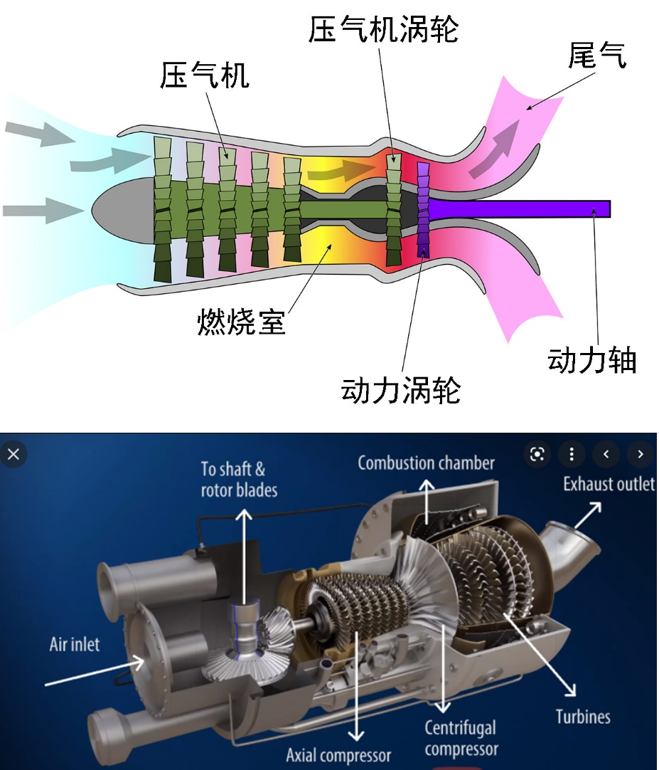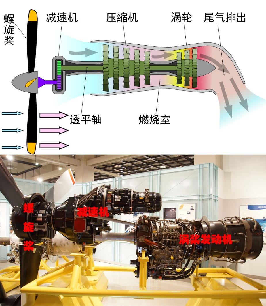 图 13:涡桨发动机结构示意图(上)及GE T64涡桨发动机实物照片(下)