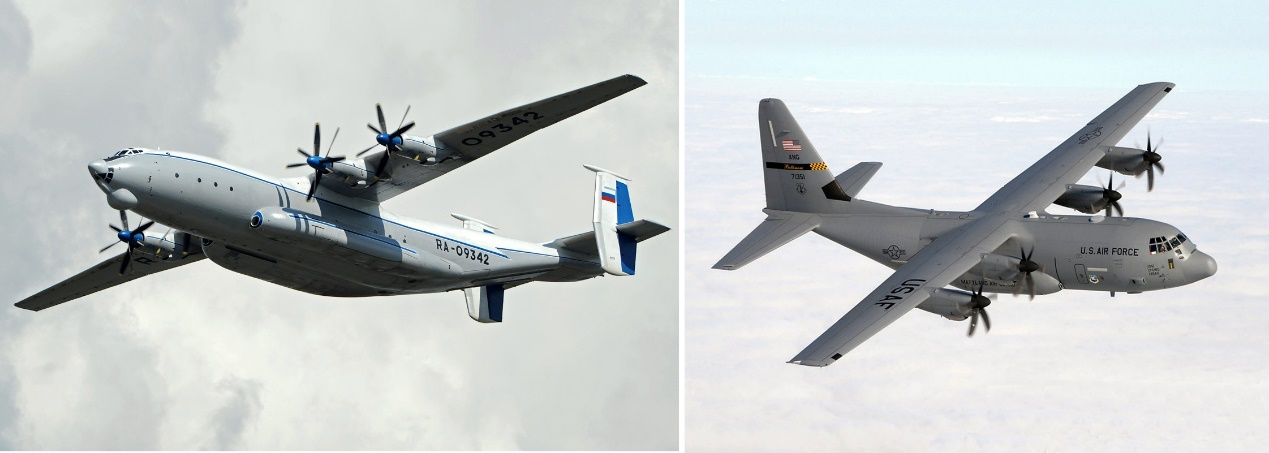 图14:前苏联安-22军用运输机(左)和美国超级大力神(右)军用运输机照片