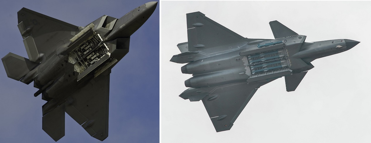 图 12:美军F-22战斗机(左)和解放军J-20战斗机(右)底部照片