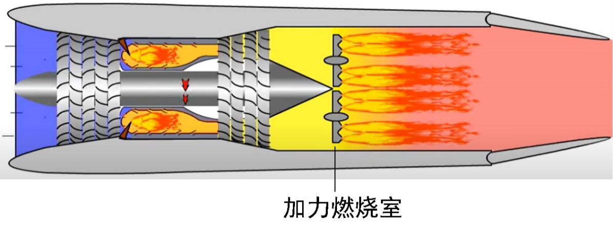 在此基础上,军用超音速战机往往会在涡喷发动机的涡轮后方再增设一个额外的燃烧室,再次加热能量已被涡轮消耗的喷射气流,使其以更高的速度从喷嘴喷出。这一结构被称为加力燃烧室(Afterburner)或后燃室,加力燃烧室的油耗一般是涡喷发动机燃烧室的数倍,但是可以提升最高50%的推力。