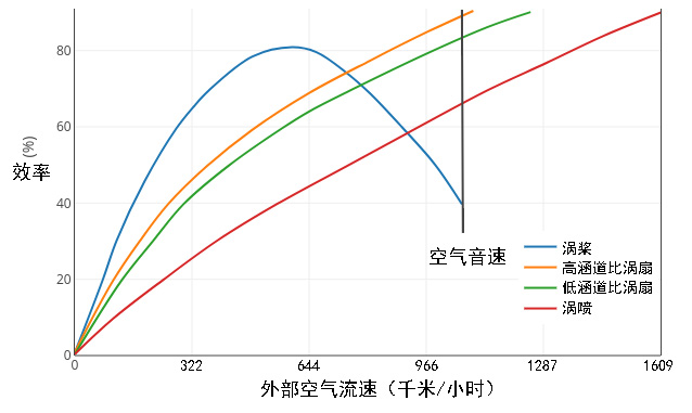 图8:几种航空发动机在不同空气流速下的效率对比(基于高空测试数据)