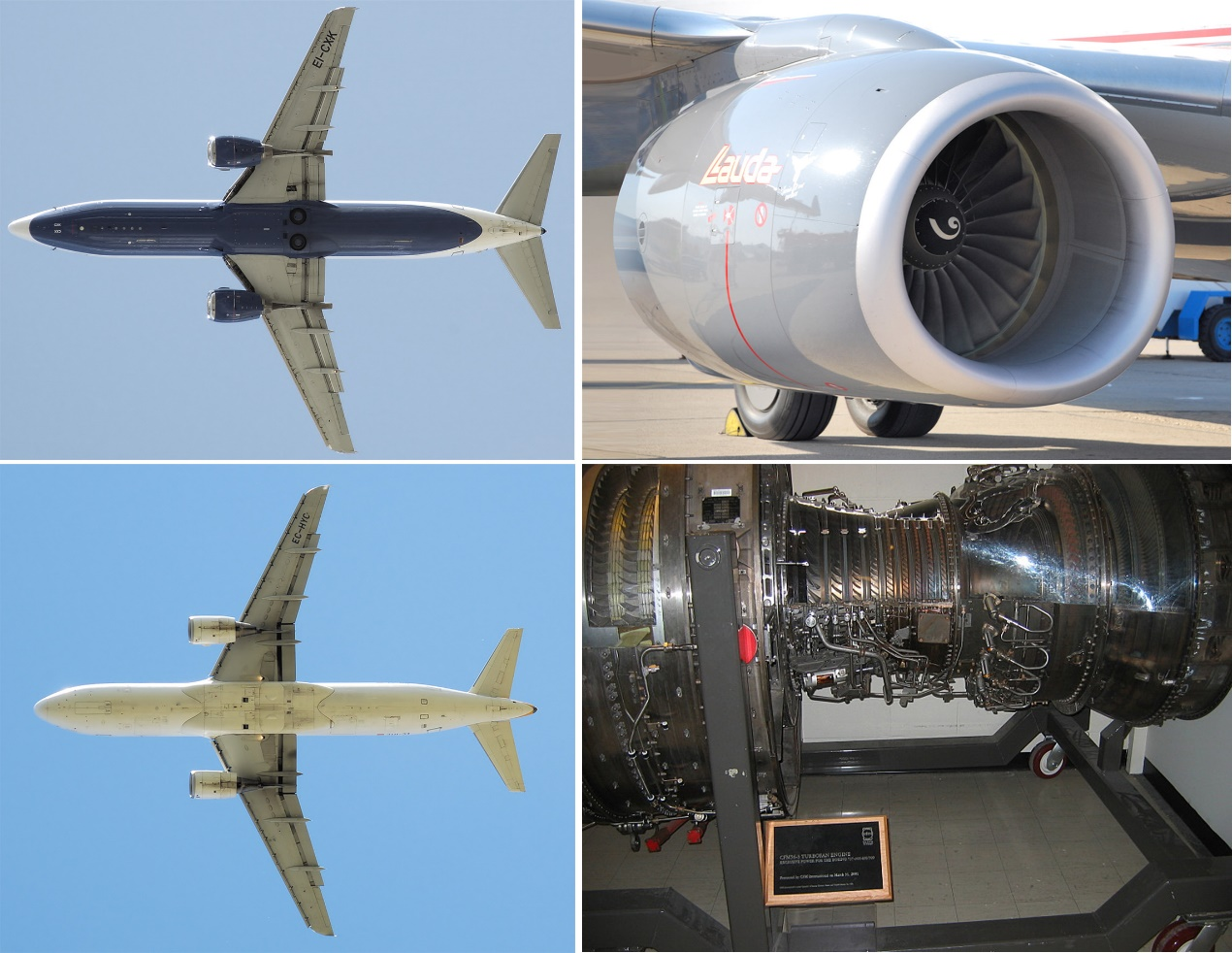 图10:左上到右下:波音737底部照片、波音737发动机近照、空客A320底部照片和CFM56涡扇发动机照片