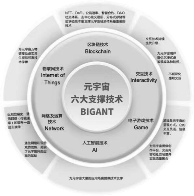 Matthew Ball指出,目前能承载元宇宙数百万级人数同时在线并同步交互的基础设施技术还未出现,英特网也并非为元宇宙所设计。而《元宇宙通证》一书中指出,支撑“元宇宙”的六大技术包括:区块链技术、交互技术、电子游戏技术、人工智能技术、网络及运算技术、物联网技术。与上述六大技术相关联的还有许多细分技术,如云计算、实时渲染、分布式存储等。