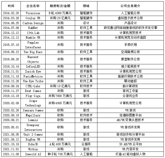 Meta早在2014年就以20亿美元的价格收购了专业VR设备生产商Oculus公司,并从2014年开始布局元宇宙赛道,投资并购领域覆盖VR硬件、VR游戏、人工智能、内容发行平台等。
