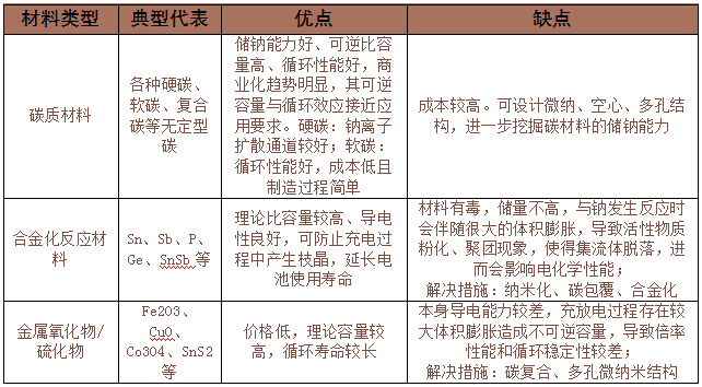 负极材料方面,由于钠的半径较大,不能在石墨层中可逆的脱嵌,因此不能选择锂离子电池的石墨材料作为负极材料。常见的钠离子电池负极材料包括碳质材料、合金化反应材料和金属氧化物/硫化物等。其中,虽然合金化反应材料和金属氧化物/硫化物理论比容量较高,但充放电过程会伴随较大的体积膨胀进而影响电池电化学性能,而以硬碳为代表的碳质材料具备嵌入钠离子能力强、体积变形小、扩散通道好、化学稳定性好等特点,商业化前景最被看好。