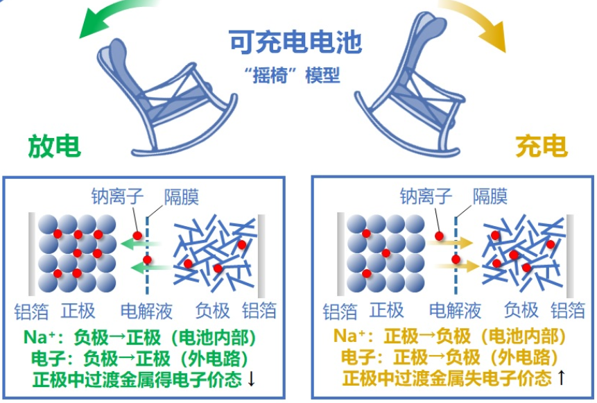 钠离子电池与锂离子电池工作原理类似,也是一种“摇椅式”电池。钠离子电池作为充电电池的一种,主要由正负极、电解液、隔膜、集流体等组成。其工作原理是利用钠离子在正负极之间的可逆脱嵌实现充放电,与锂离子电池类似。