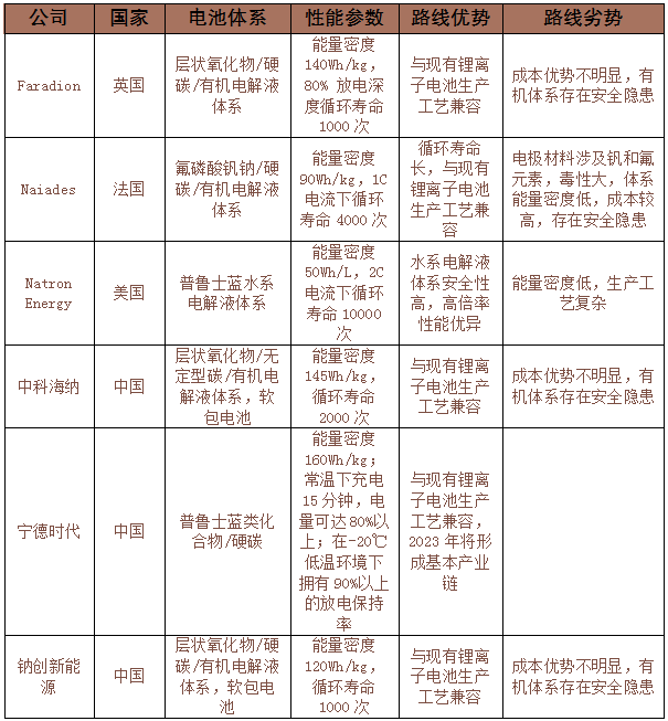 截止2020年,全球从事钠离子电池工程化的公司超过20家,包括英国Faradion、法国Naiades、日本岸田化学、松下、丰田、美国NatronEnergy等。我国钠离子电池生产企业以中科海钠、宁德时代、钠创新能源、星空钠电等为代表。中科海钠成立于2017年,是我国首家钠离子电池公司,依托中国科学院物理研究所的技术,目前在技术开发和产品生产上都初具规模;宁德时代于2021年7月29日发布了第一代钠离子电池,其能量密度略低于磷酸铁锂电池,电芯单体能量密度可达160Wh/kg,是目前全球最高水平,在常温下充电15分钟,电量可达80%,零下20℃低温环境下仍然有90%以上的放电保持率。