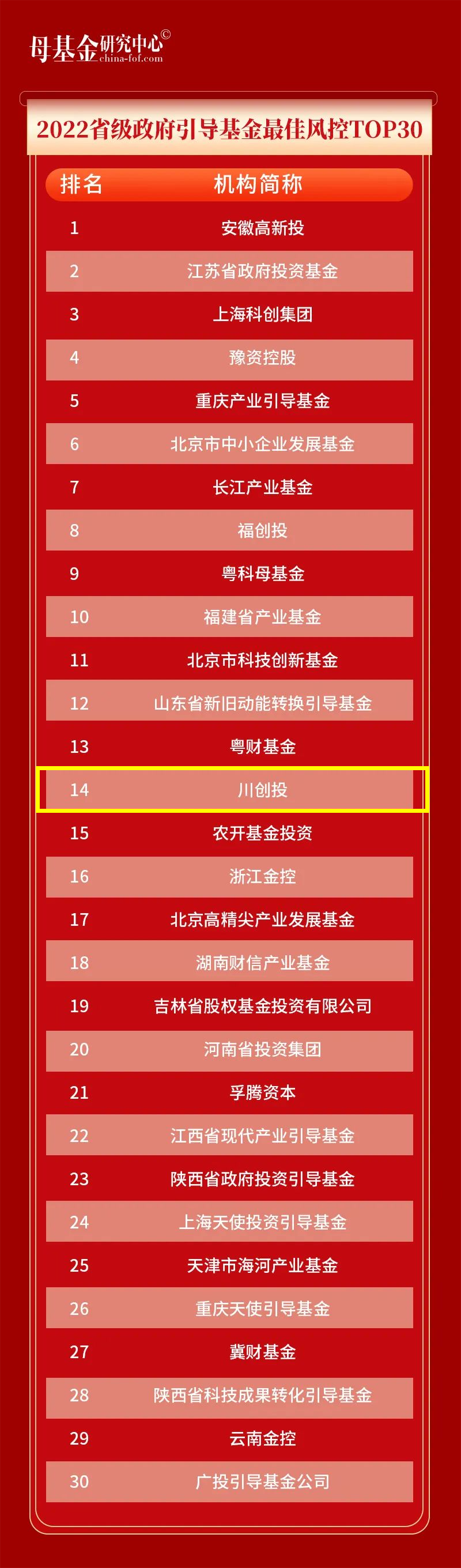 2022年7月31日,母基金研究中心正式发布“2022年中榜单”,以此鼓励私募股权母基金与基金行业的优秀机构与人才,促进股权投资行业的健康发展。凭借旗下政府引导基金优异的市场表现,四川振兴集团下属公司「川创投」荣膺“2022省级政府引导基金最佳风控TOP30”殊荣。