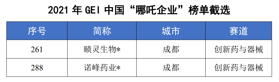 据了解,“哪吒企业”代指成立时间不超过3年并获得1亿元人民币以上融资的新经济新物种企业,具有成立时间短、成长起点高、赛道领域新、场景创新强等特征。报告显示,截至2021年12月31日,入围“哪吒企业”榜单的企业共323家(其中新晋“哪吒企业”210家),它们分布于35个主赛道和40座城市,上海和北京是主要聚集地。「川创投」已投企业「赜灵生物」「诺峰药业」均位列其中。