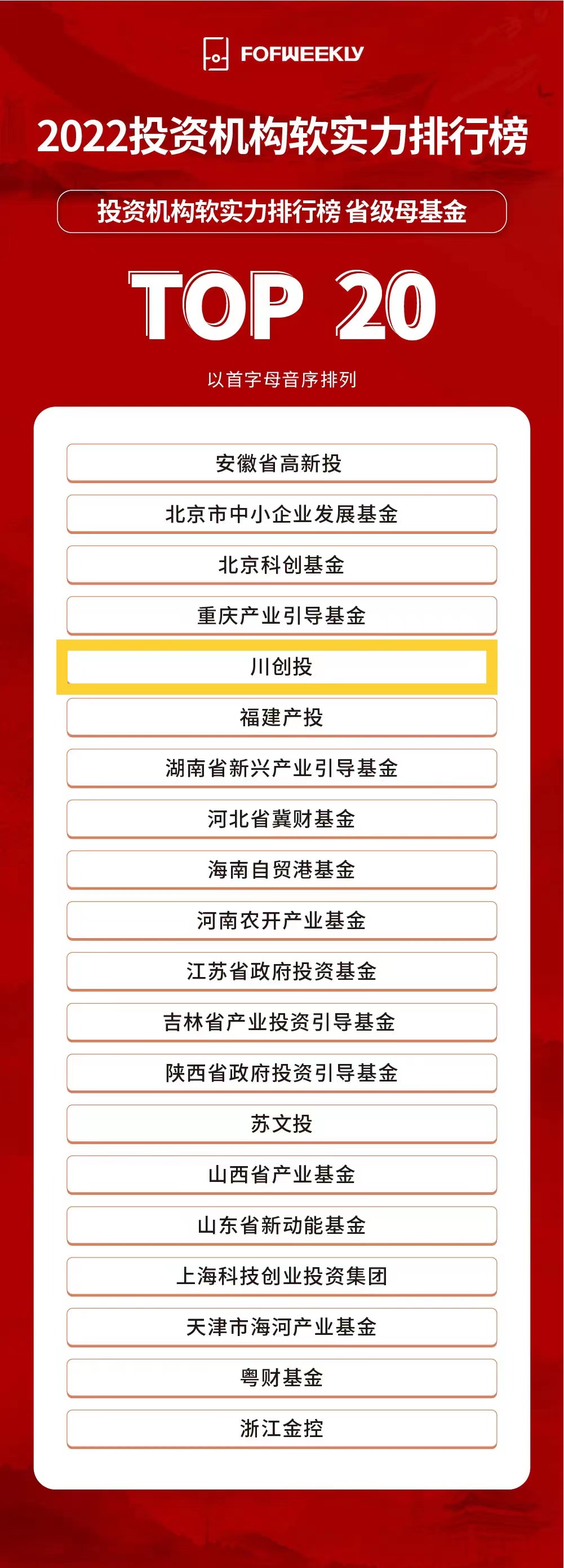凭借自身在国内私募股权投资领域的优异表现,「川创投」荣膺“2022投资机构软实力排行榜-省级母基金TOP20”殊荣,成为该榜单中仅有的两家中国西部地区省级母基金管理机构之一。