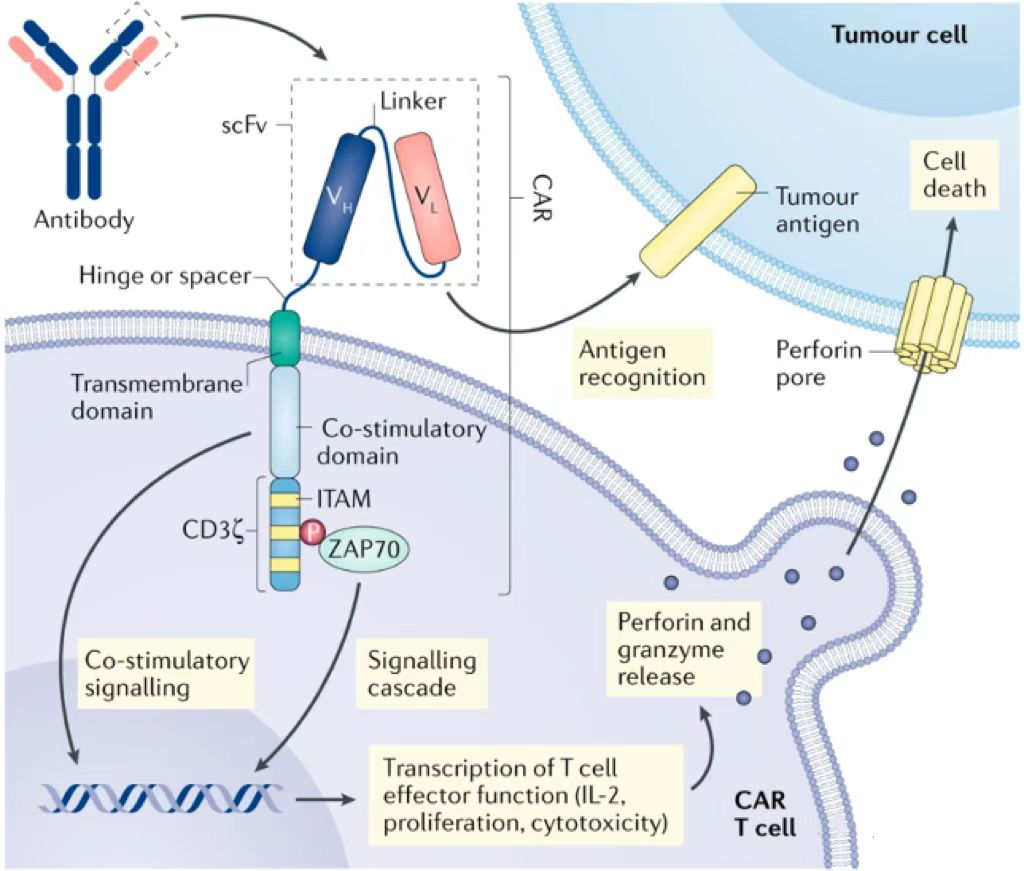 CAR-T细胞主要由三部分组成,即胞外区、跨膜区和胞内区域,由抗体的单链可变区域(scFv)与T细胞表面受体嵌合于T细胞上。胞外区常为单链抗体(scFv),负责识别并结合靶抗原;跨膜区是铰链或间隔区,可将scFv锚定于细胞膜上;胞内信号域由共刺激因子和CD3信号域组成。当抗原被识别和结合后,产生刺激信号传至胞内信号域,T细胞被激活并发挥效应功能。