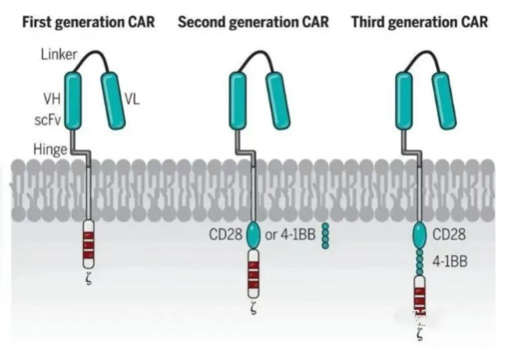 第一代CARs由胞外抗原识别区即单链可变片段(scFv)组成,融合跨膜区和T细胞受体(TCR)CD3ζ 分子胞内信号域。然而,由于一代CAR-T细胞扩增慢和持久性差,在临床试验中疗效甚微。