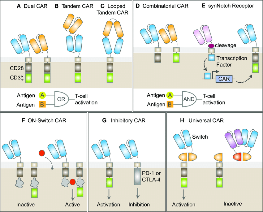 第四代CAR-T细胞,也称为精准CAR-T细胞,结构设计主要从肿瘤等疾病的精准治疗角度考虑。设计思路包括为CAR-T细胞设计一个安全开关,在CAR的胞内部分插入一个光开关蛋白LOV2;在CAR的结构中添加自杀基因或者可控性自杀基因(例如某些药物敏感基因),从而实现对CAR-T细胞在体内存货时限的可控;添加细胞因子或者趋化因子受体结构,从而增加T淋巴细胞在肿瘤组织中的浸润,达到增强杀伤实体瘤的效果。