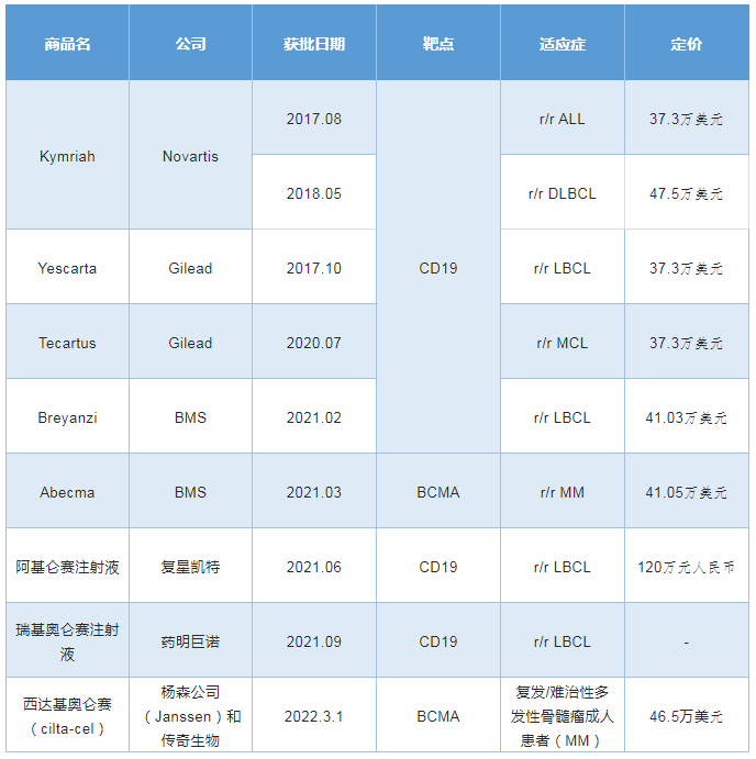 2021年6月22日,复星凯特CAR-T细胞治疗产品益基利仑赛注射液已正式获得批准,标志着中国迎来首款获批上市的CAR-T细胞治疗产品,也是中国首款获批上市的细胞药物。2021年9月3日,药明巨诺靶向CD19的CAR-T产品阿基奥仑赛注射液获批,适应症为用于治疗经过二线或以上系统性治疗后成人患者的复发或难治性大B细胞淋巴瘤(r/r LBCL)。这是国内第2款获批的CAR-T产品,同时也是全球第7款获批的CAR-T产品。