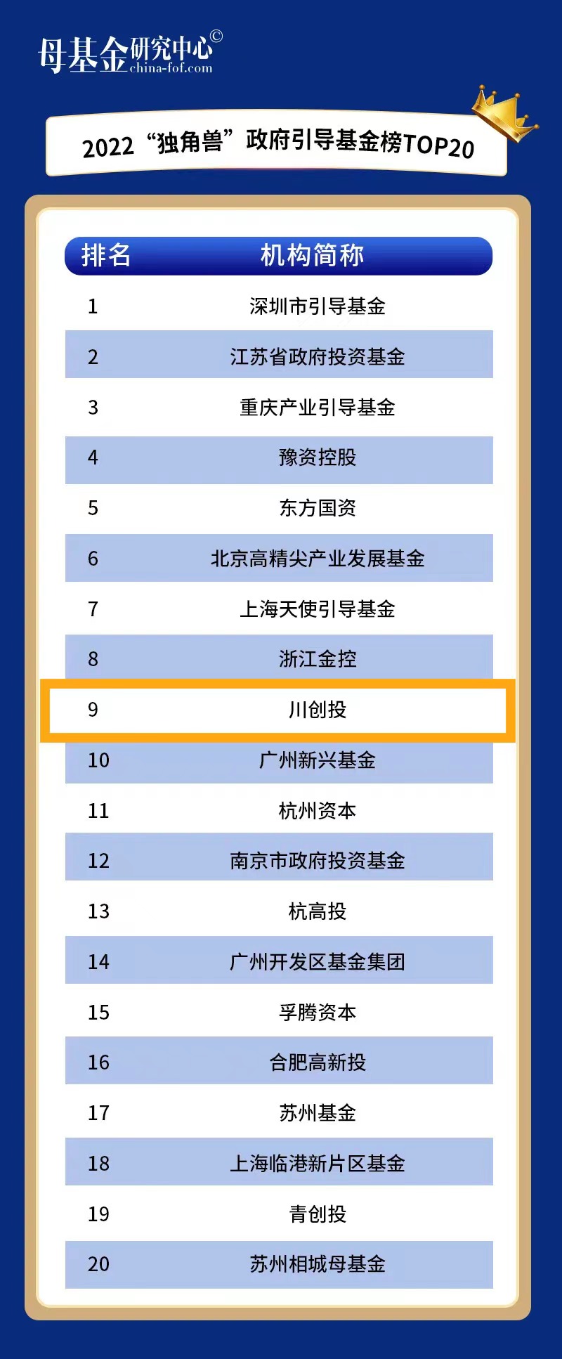 11月12日,母基金研究中心根据已有的数据支撑与研究分析正式对外发布2022年度专项榜单,「川创投」荣膺“2022‘独角兽’政府引导基金榜TOP20”殊荣,成为该榜单中仅有的两家中国西部地区政府引导基金管理机构之一——这也是自2015年12月成立以来,「川创投」及旗下管理基金累计第28次入围由国内股权投资行业权威机构发布的权威榜单。