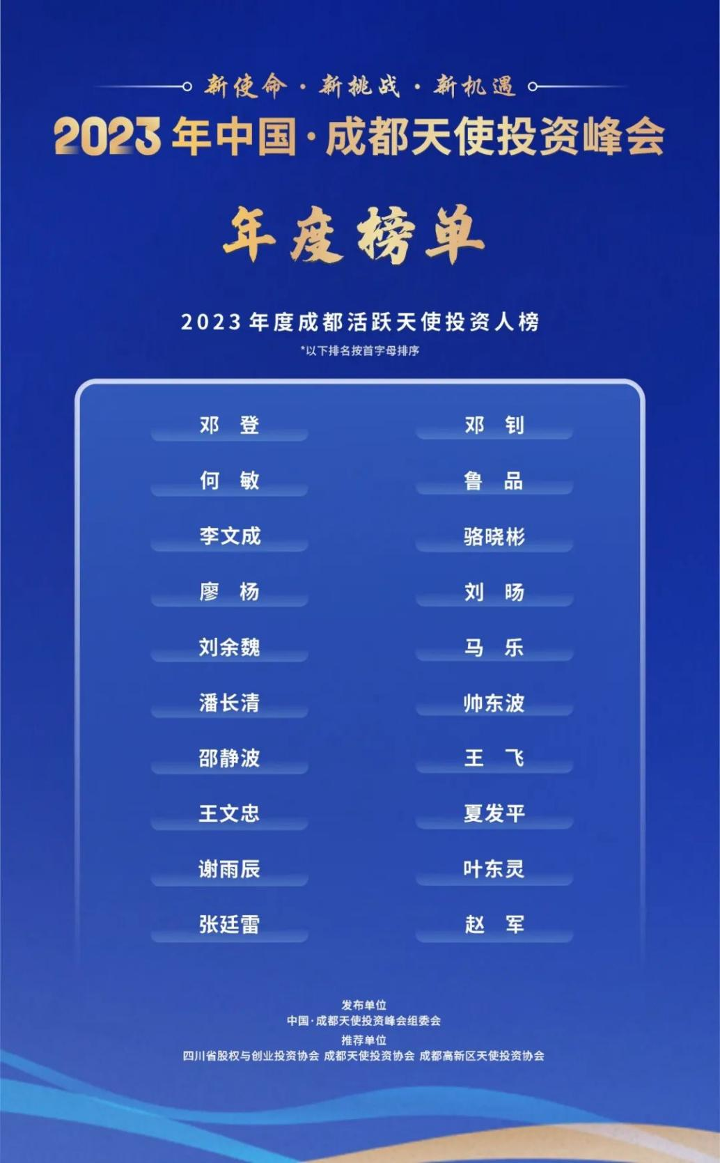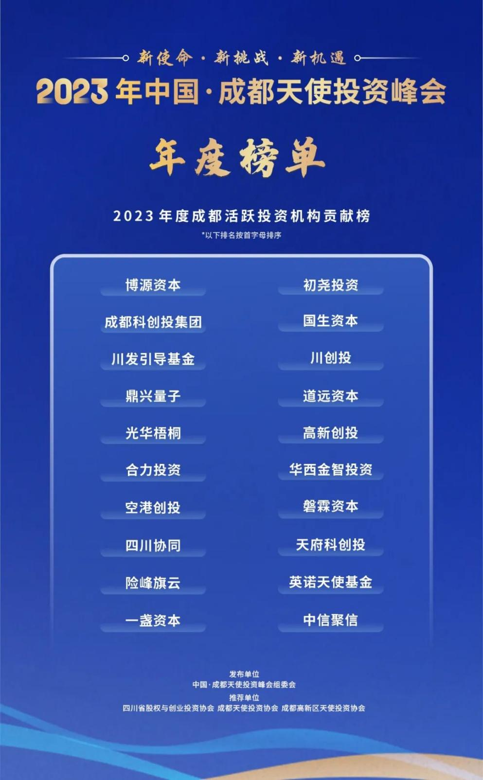 2023年10月18日,在成都高新区管理委员会主办的“2023年中国·成都天使投资峰会”上,正式揭晓了2023年中国·成都天使投资峰会年度两大榜单,川创投荣获“2023年度成都活跃投资机构贡献奖”、川创投董事长王文忠荣登“2023年度成都活跃天使投资人榜”。