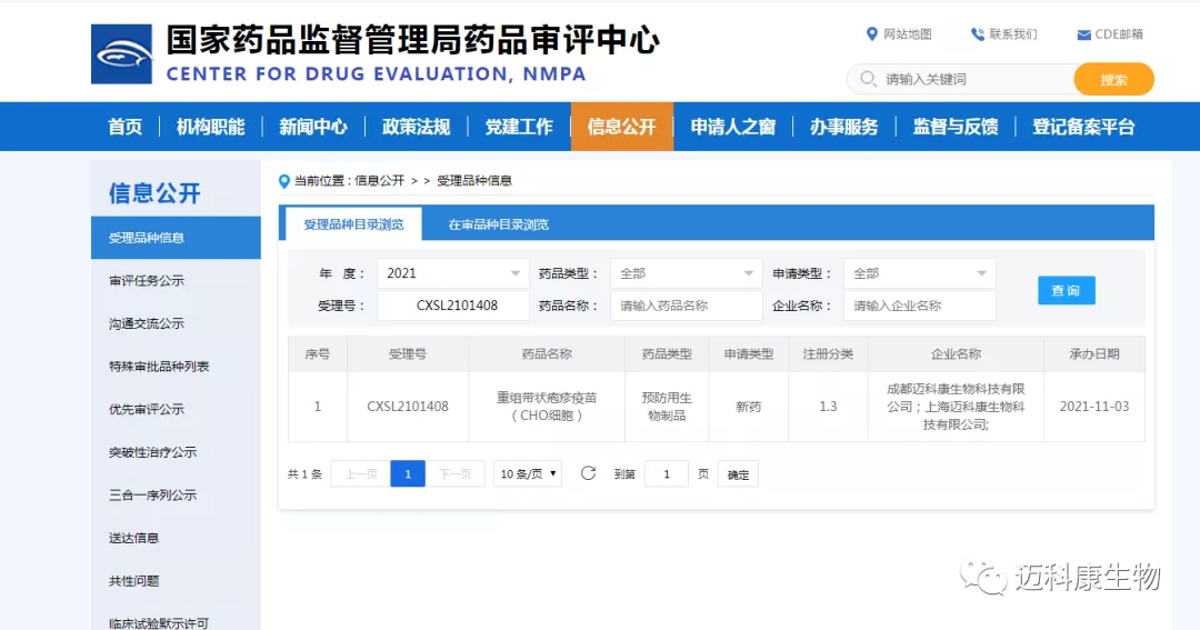 而就在近日,「迈科康」再次传来喜讯——由该企业与其子公司上海迈科康生物科技有限公司联合申报的“重组带状疱疹疫苗(CHO细胞)”临床试验申请获得国家药品监督管理局(NMPA)的受理通知书(受理号:CXSL2101408),自受理之日起60日内若未收到药审中心否定或质疑意见,「迈科康」可按照提交的方案开展临床试验。据悉,截至目前全球范围内已上市的同类产品仅有葛兰素史克公司的带状疱疹重组亚单位疫苗和美国默克公司的带状疱疹减毒活疫苗。