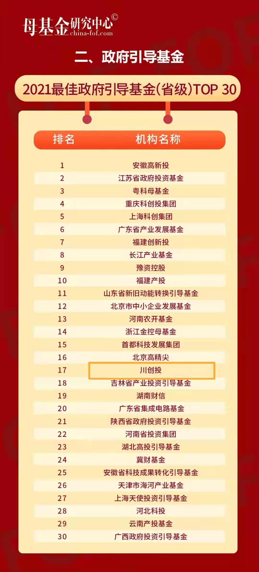 近日,四川振兴集团下属公司川创投凭借旗下政府引导基金优异的市场表现荣膺母基金研究中心“2021最佳政府引导基金(省级)TOP30”的殊荣。
