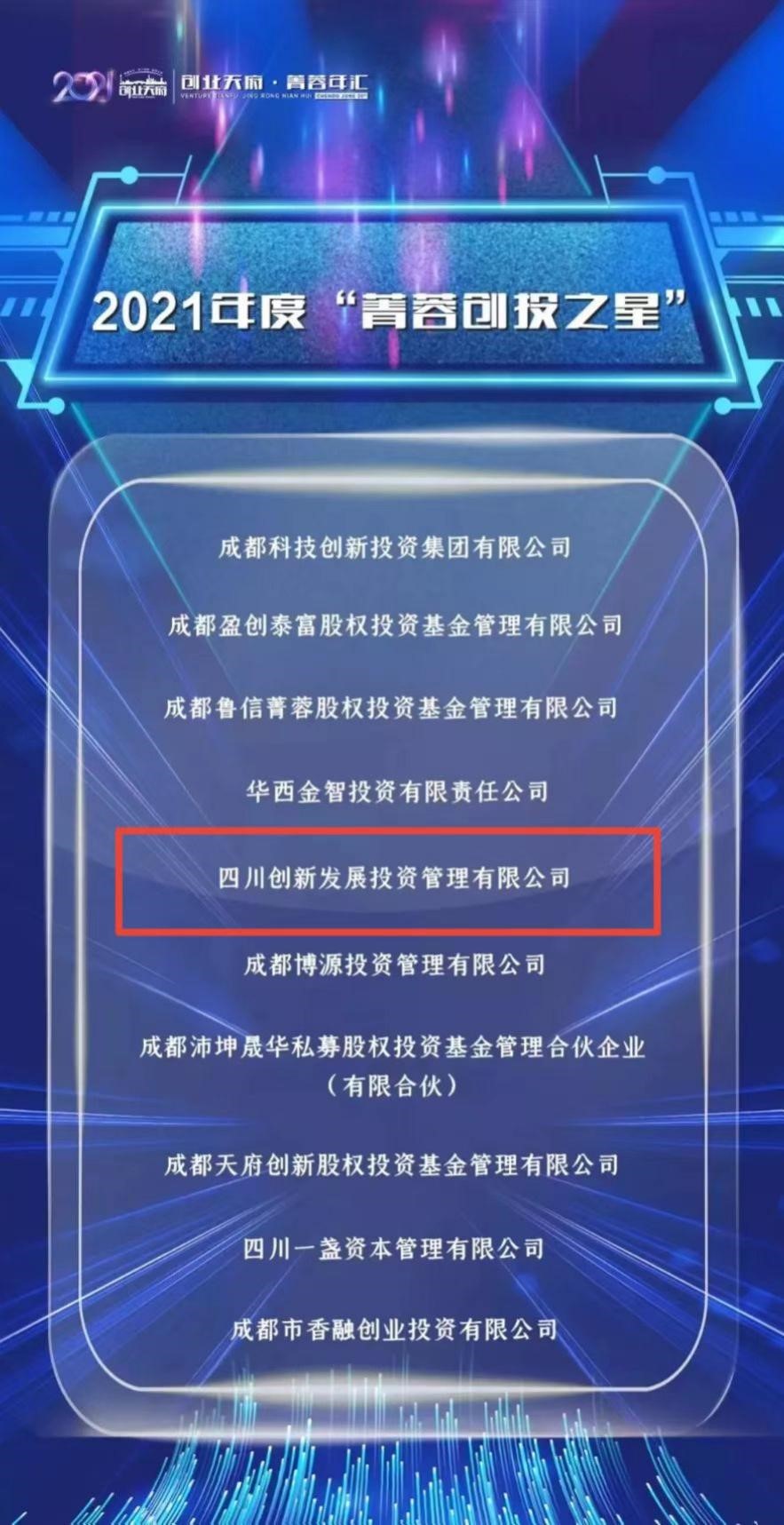 “菁蓉创孵之星”“菁蓉创投之星”和“菁蓉创业之星”评选,旨在通过深度挖掘双创孵化载体、双创投资机构发展标杆和先进典型创业人物,充分展示创业者个人突出成就,彰显成都双创孵化载体及双创投资机构发展特色与成效。凭借2021年在成都市创投领域的优异表现,四川振兴集团下属公司川创投获得了2021年度“菁蓉创投之星”殊荣。