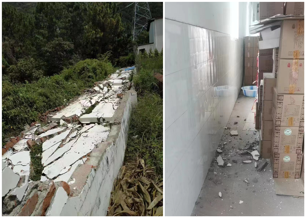 泸定县桑吉卓玛酒业公司倒塌的工厂围墙和库房墙体部分受损