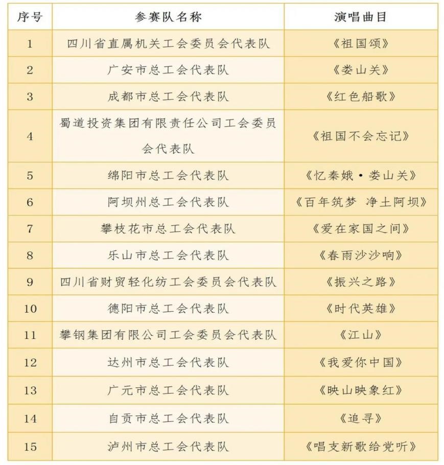 本次参加总决赛的队伍除了成都片区赛决出的四川振兴集团代表队、蜀道投资集团代表队、四川省直属机关代表队、成都市总工会代表队外,还有来自绵阳、德阳、阿坝、乐山、泸州、自贡、广元、广安、达州、攀枝花和攀钢集团等11支片区赛中获胜的队伍。入围总决赛的这15支代表队带来的作品,无论是在思想性、艺术性方面还是在声音与舞台表现力方面,都代表着我省职工合唱的最高水平,决赛全过程表演精彩纷呈。