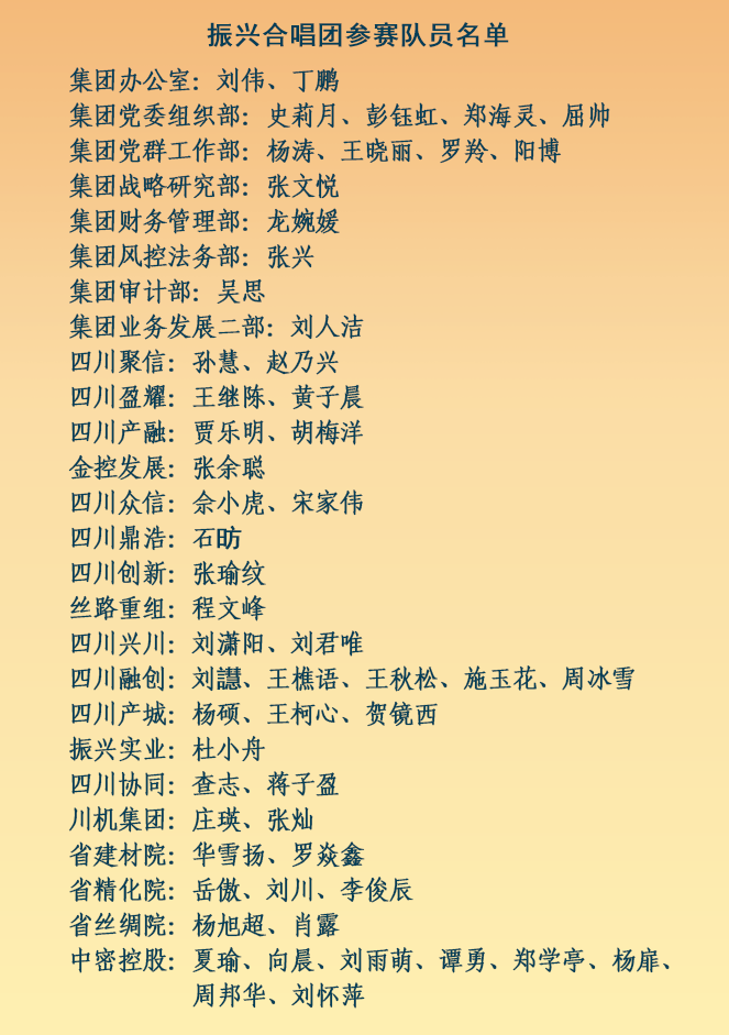 振兴合唱团参赛队员都来自四川振兴集团总部及下属公司,他们中有投资领域的行家,有党建、财务、风控、审计等岗位的业务骨干,有长期坚守在最平凡岗位、奋战在生产一线的普通职工,还有来自机械制造、精细化工、丝绸、建筑等研究领域的岗位能手。他们,是“振兴四川产业,促进天府创新”征途上的最美劳动者!
