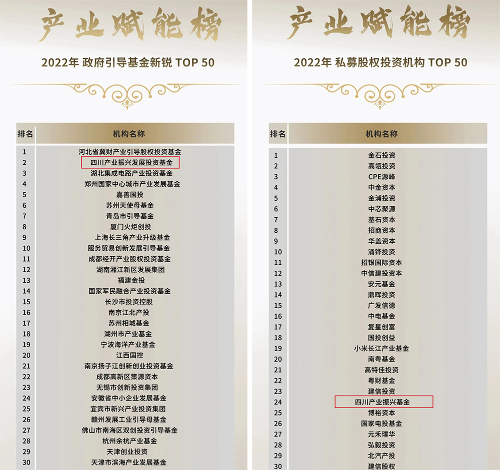 近日,LP智库数据库发布了2022 LP/GP“产业赋能榜” 榜单,对2022年政府引导基金及所投子基金进行了数据画像。根据政府引导基金近3年(2019年12月1日-2022年11月30日)直接出资的子基金数量、出资规模和近3年直接出资子基金的放大倍数进行统计,并剔除其他扰动因素,评选出政府引导基金新锐TOP50。根据管理子基金数量、政府引导基金出资规模、直接投资企业数量和引导基金放大倍数等因素,评选出私募股权投资机构TOP50。四川振兴集团入选双榜单,分别位列政府引导基金新锐TOP50第2位和私募股权投资机构TOP50第24位。