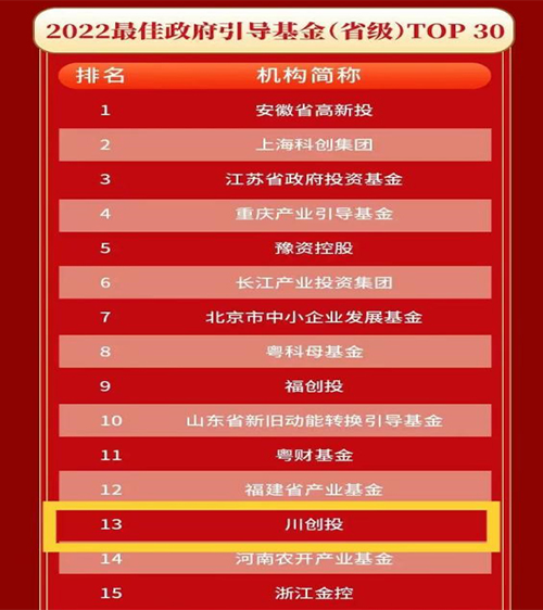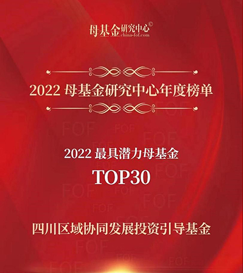 继2022年12月荣膺第六届股权投资金牛奖“金牛产业引导基金”殊荣后,由四川兴川受托管理的四川区域协同发展投资引导基金,凭借去年在募投管退各环节的良好业绩,登上母基金研究中心“2022最具潜力母基金TOP30”榜单。