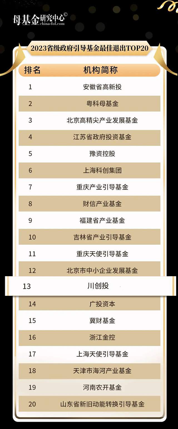 近日,母基金研究中心正式发布2023年度专项榜单,四川创新发展投资管理有限公司获评“2023省级政府引导基金最佳退出TOP20”。