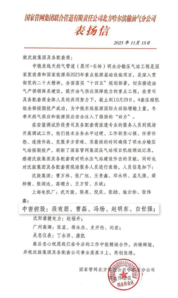 截至目前,中密控股已完成天然气管道配套100余台套,市场份额稳居行业第一,为保障国家能源行业发展安全以及我国冬季天然气供应发挥了重要作用。