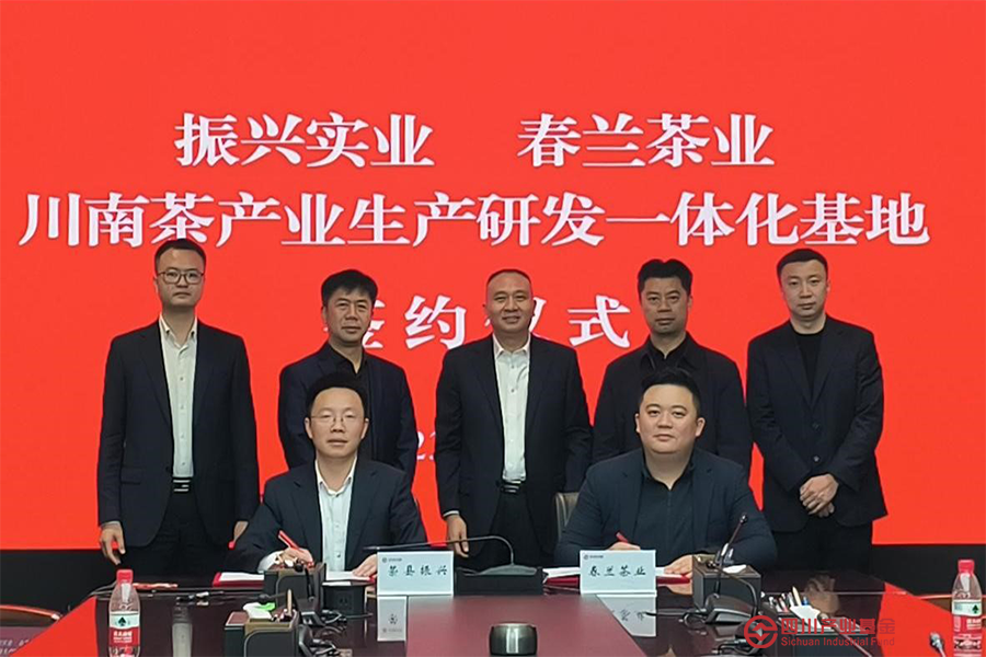 近日,四川产业基金旗下荣县振兴供应链管理有限公司与自贡市春兰茶业有限公司在四川振兴(高新)双创基地举行了签约仪式,标志着川南茶产业生产研发一体化基地项目正式落户荣县振兴产业园。四川产业基金总经理助理、振兴实业董事长刘怀笔出席并主持签约仪式,振兴实业副总经理邓鞒,振兴实业总经理助理、荣县振兴董事长田虞及春兰茶业相关负责人参加活动。