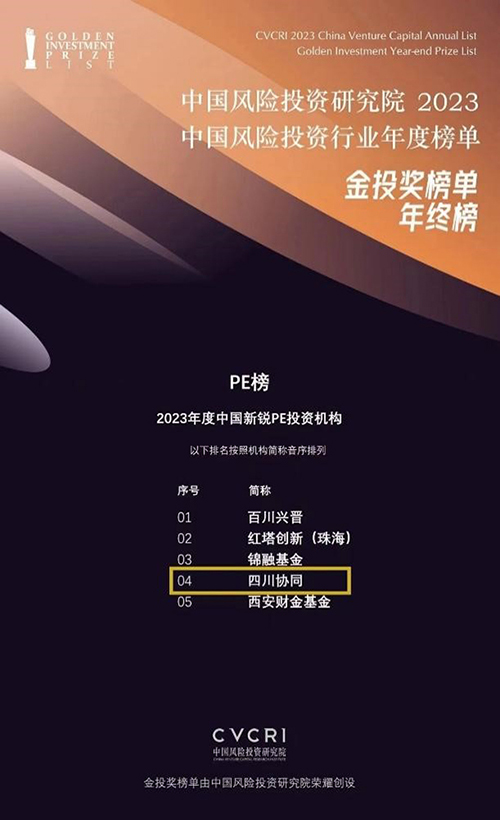 近日,由中国风险投资研究院发布的“2023中国风险投资行业年度榜单——金投奖榜单年终榜”正式揭晓。四川产业基金旗下四川协同振兴私募股权投资基金管理有限公司首次荣获“2023年度中国新锐PE投资机构”称号。