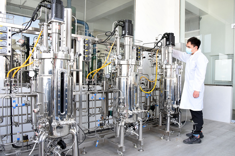在该平台中试车间,有的生产罐一人高,有的生产罐有3层楼高。从50升小试设备到50吨产业化设备,再到配套的检测分析设备,在这里可实现微生物菌剂、多聚氨基酸、生物多肽等合成生物学产品的研发改进、检验检测及生产加工。
