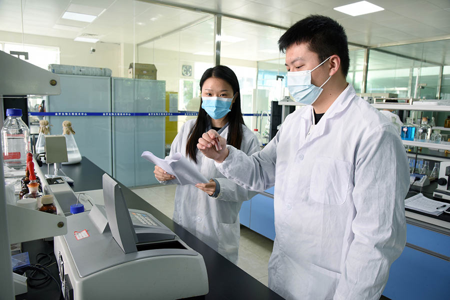 研发人员正在工程技术中心检测分析发酵液状态。成都金开生物工程有限公司供图
