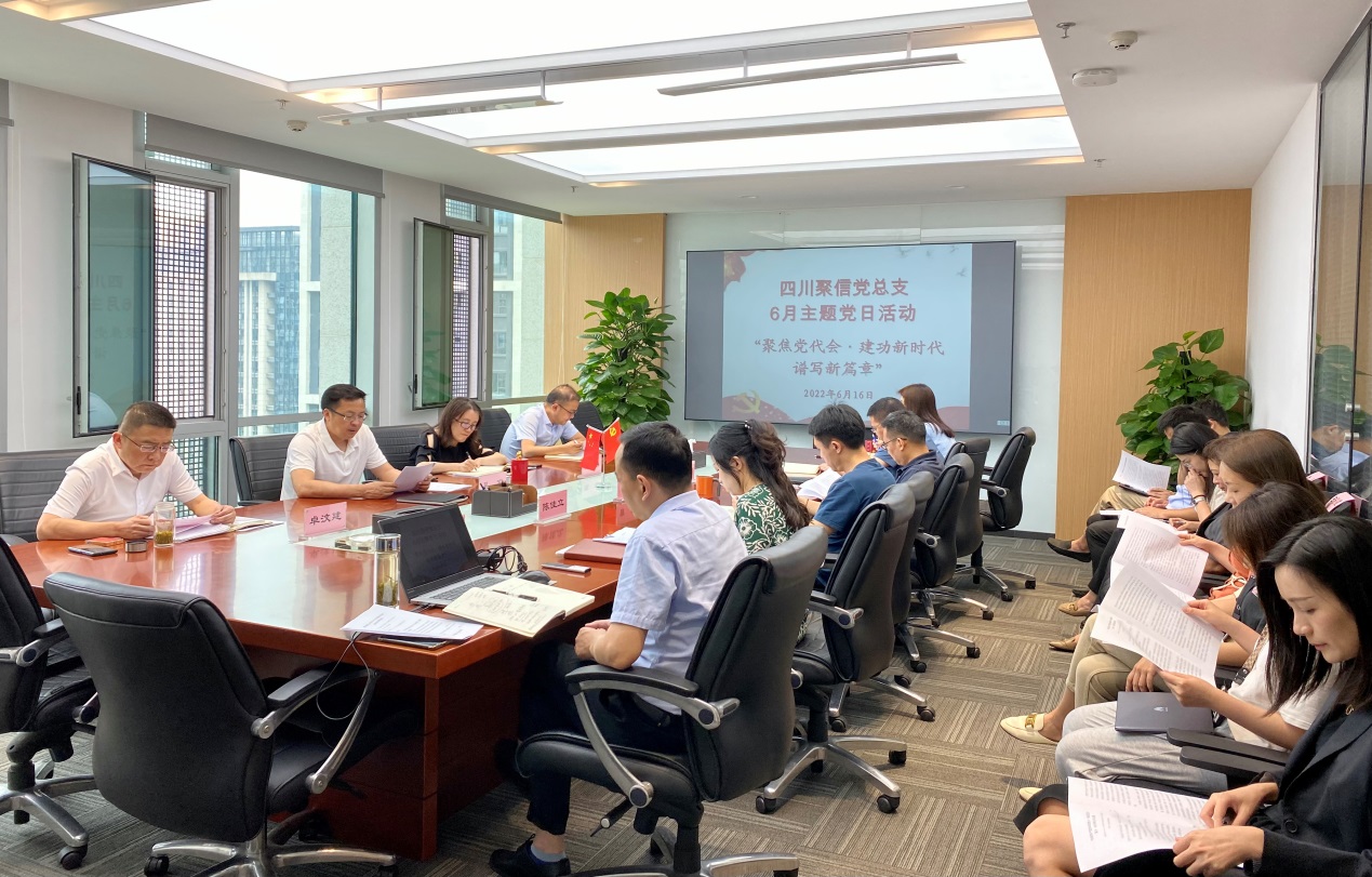 6月16日,四川聚信党总支组织开展了“聚焦党代会•建功新时代•谱写新篇章”主题党日活动。会议由公司党总支书记、董事长、总经理吴军主持,公司班子成员、全体党员、各部门负责人、工会委员及职工代表参加了会议。