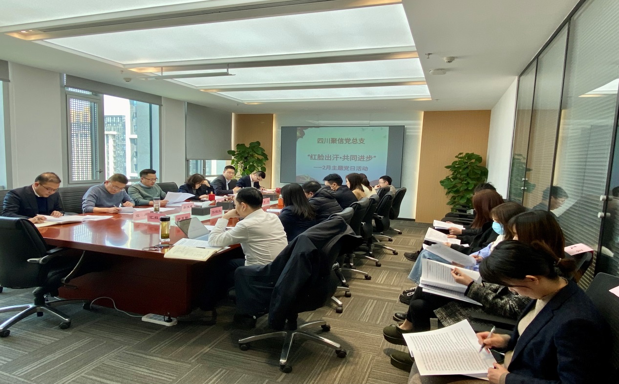 2月24日,四川聚信党总支组织开展了“红脸出汗•共同进步”主题党日活动。会议由公司党总支书记、董事长、总经理吴军主持,公司领导、全体党员、各部门负责人参加了会议。