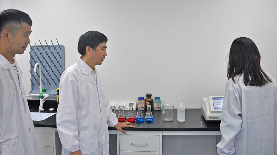 2022年7月13日,蒲实(中)在实验室参与绍兴市柯桥区印染产业集聚中心企业提出的共性技术研究工作