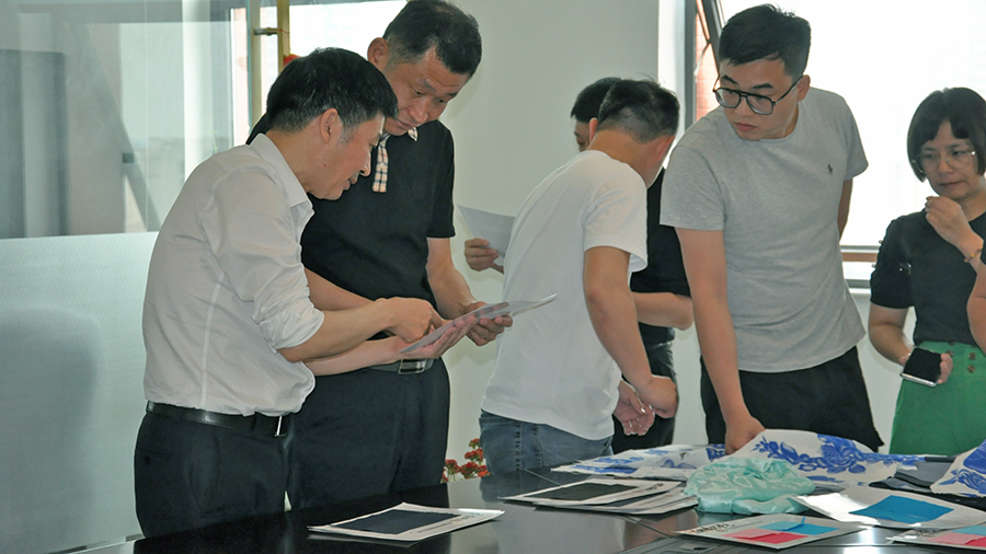 2021年5月20日,蒲实(左一)为福建省石狮市印染企业考察团介绍纺科院新技术新产品