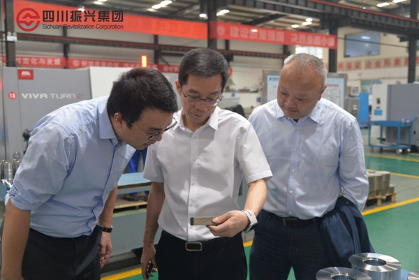 川机院党委副书记、董事、总经理彭玮(中)在中密控股生产车间关心生产情况(图片由受访者提供)