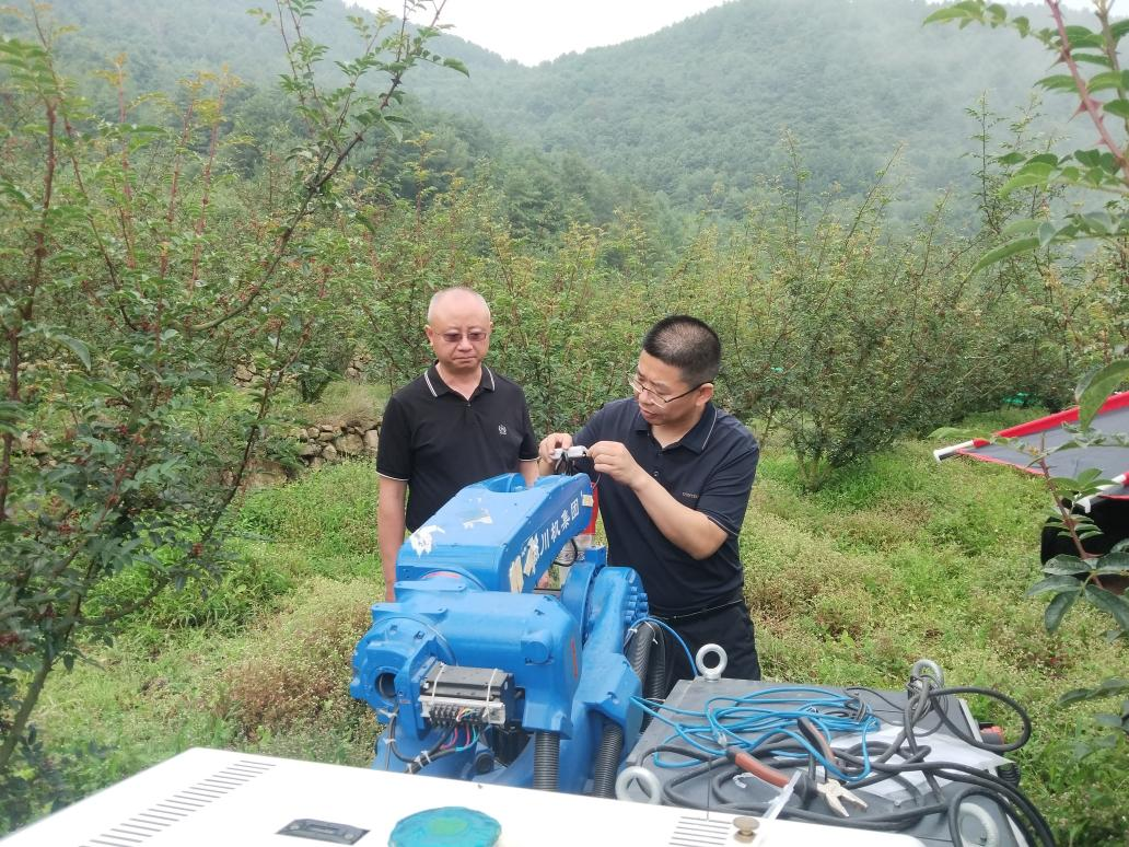 刘雪垠(右)在田间测试智能花椒采摘机器人。(川机集团供图)