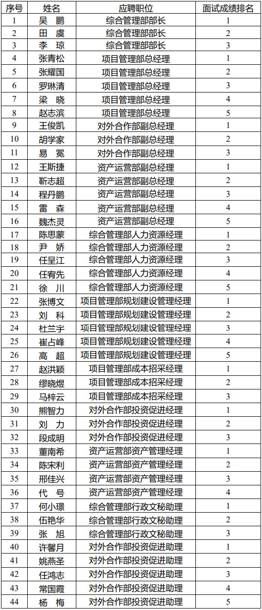按照《四川振兴产业园实业有限公司2021年度公开招聘工作人员面试工作方案》,我公司于2021年8月8日组织了面试,现将面试结果公告如下: