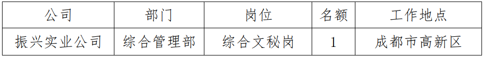 四川振兴产业园实业有限公司(简称“振兴实业公司”)系四川振兴集团全资子公司,公司根据业务发展需要,现面向社会公开招聘振兴实业公司工作人员,有关事项公告如下: